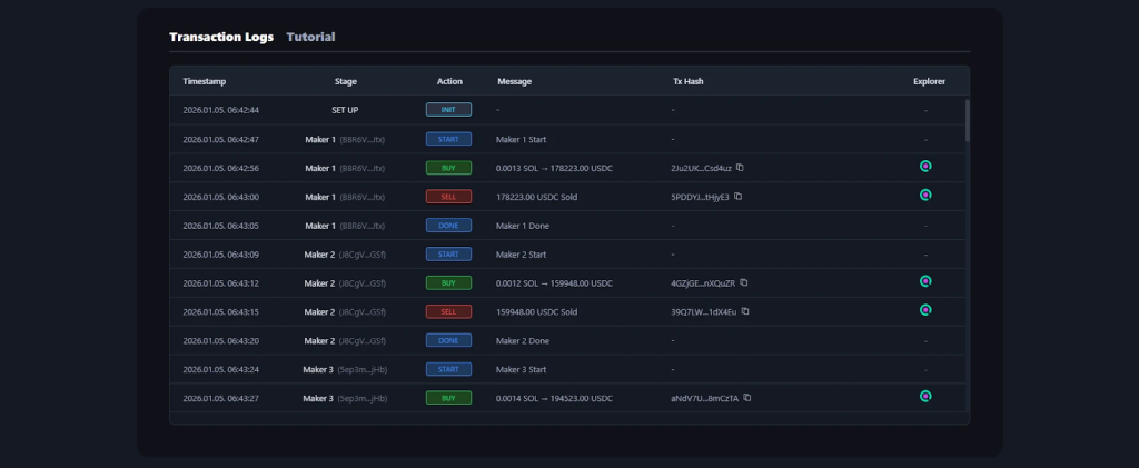 You can monitor every step of the bot execution in real-time. Click the transaction log tab to see all processes in the bot cycle. Maker wallet creation, buys, sells, and ATA/PDA rent recovery are all recorded at each step. Click any hash to verify directly on Solscan.